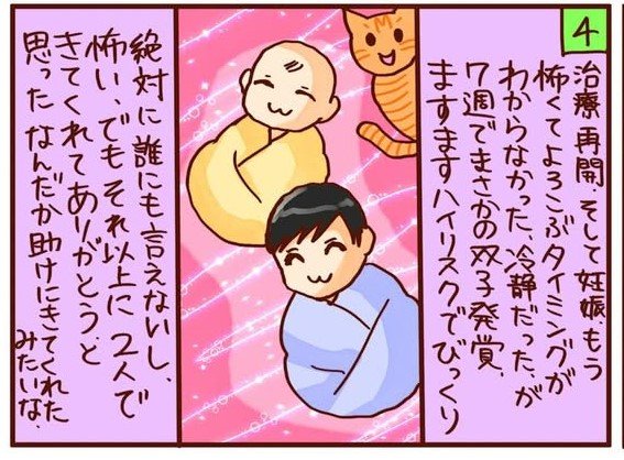 最後の4コマ目で、休養を経て不妊治療を再開した後に、妊娠したことを明かしました。