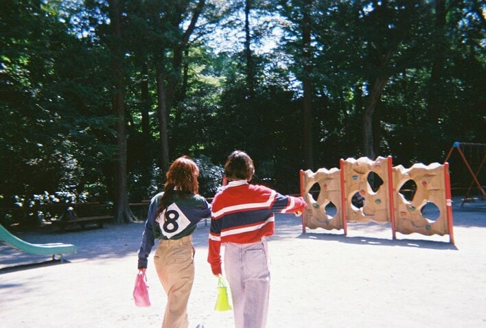 2人で仲良く公園を歩く後ろ姿や、ピッタリ密着して笑顔で自撮りをする様子、色違いのサングラスをかけた上目づかいのショット、そしておそろいのピンキーリングをつけて小指をくっつけるカット…