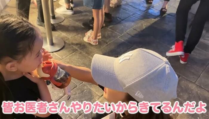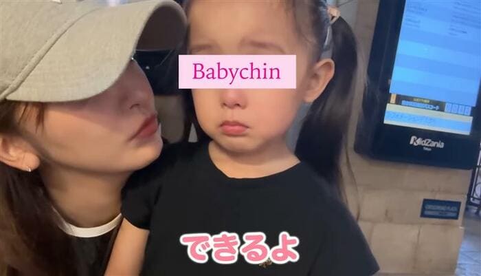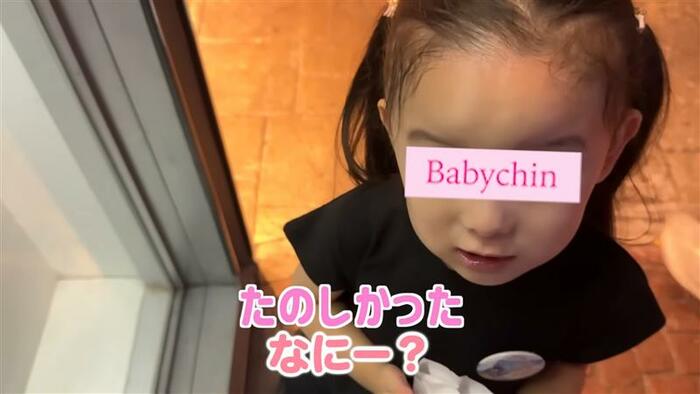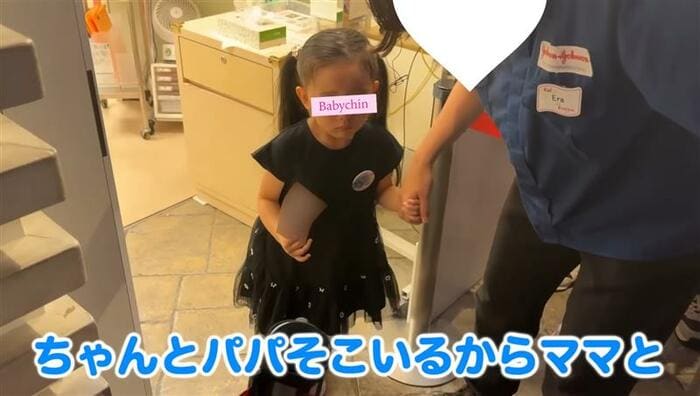 お仕事体験の時間が迫ってきますが、板野さんの手をしっかり握り、なかなか中へ入ろうとしません。板野さんによると「本当はお医者さんごっこが大好き」なようで「キッザニアのお医者さんを友だちがやってる映像見て ずっとやりたいって言って念願叶うはずの今日…」と、“ベビちん”の希望をかなえるために今回訪れたんだとか。