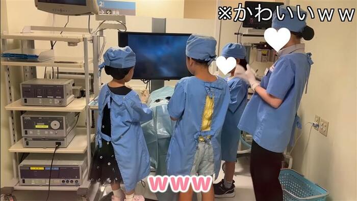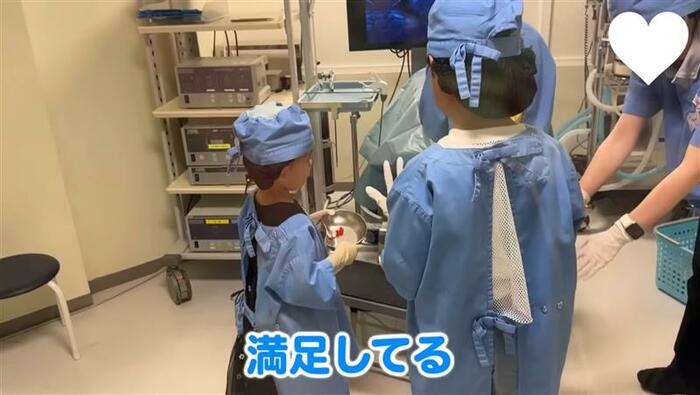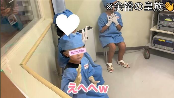 大泣きしていましたが、なんとか頑張る勇気が生まれたようで、板野さんたちが見守る手術室に、大きめの手術服を着て登場!これには板野さんも「か~わ~い~♡」とメロメロです。板野さんたちの姿を見ることができ、安心したのか、“ベビちん”は手を振る余裕も出てきています。