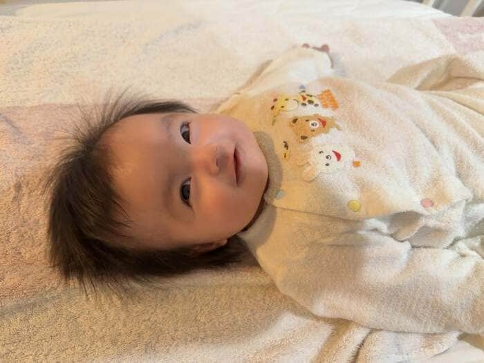 そんな川崎さん今回の投稿では、「おはよ〜 グーちゃんはよく寝てずっとニコニコしてて手がかからなくてびっくり 目覚めてすぐから笑顔なグーちゃんなのでした」と、“ググガガちゃん”の寝起きショットを公開。