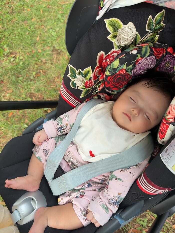 さらに別の投稿では「みんなでピクニック」とつづり、外でべビーカーに揺られながら、スヤスヤ眠る“ググガガちゃん”も披露。