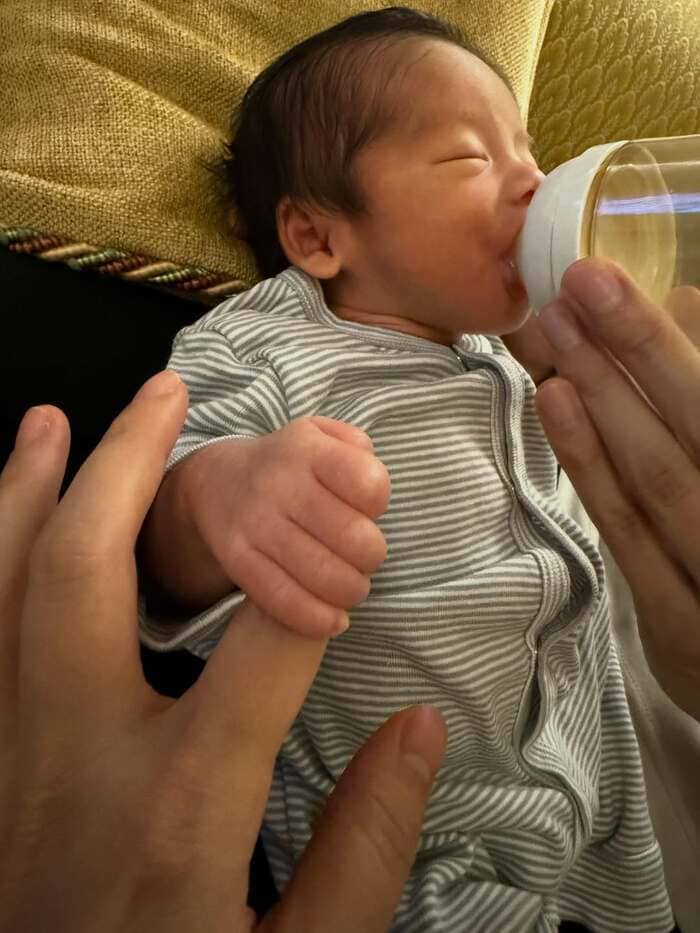 飲んでいる最中、中川さんと思われる指を、小さなおててがギュッと握りしめていますね。