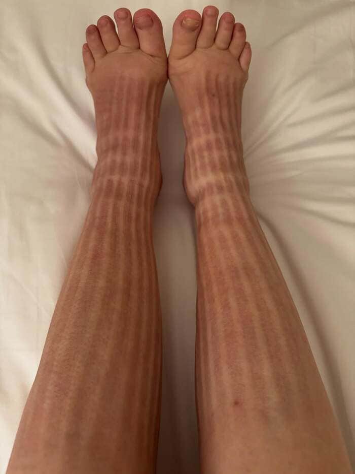 着用後の両足を見てみると、細くなっているようですが、縦線の“跡”が何本も肌にくっきりと残ってしまっています…。