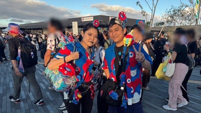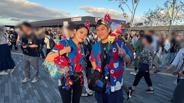 最終日の10月13日、会場を取材していると、全身ミャクミャクコーデに身を包んだ30代のカップルに遭遇。