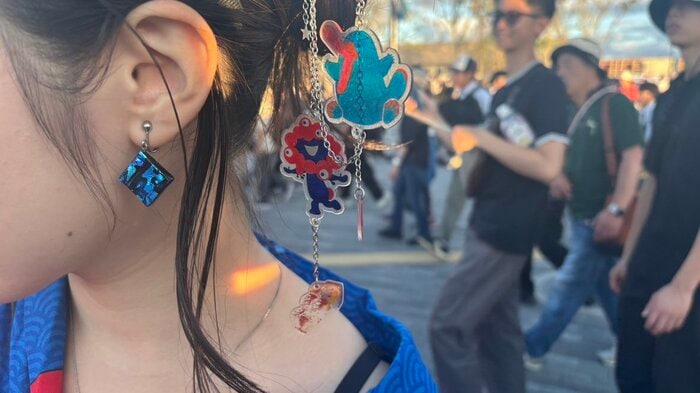 女性のアクセサリーは手作りで、ミャクミャクとカモノハシのイコちゃんのアクリルチャームで作られていました。