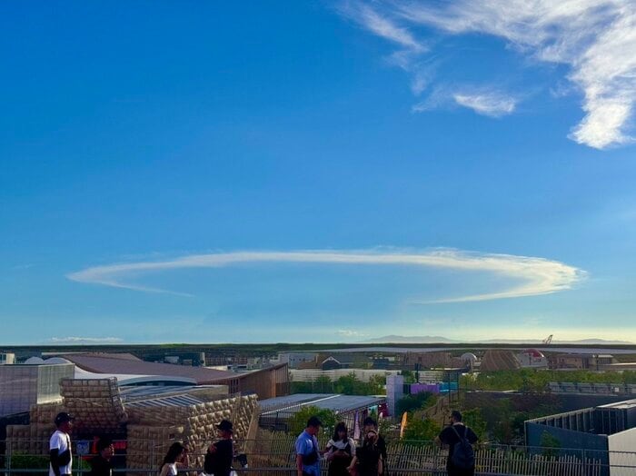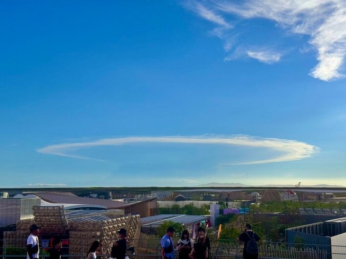 こちらは、大屋根リングの上から撮影したという、リング状の雲。大屋根リングと雲が2重のリングになった、まさに奇跡の瞬間をとらえた1枚です。