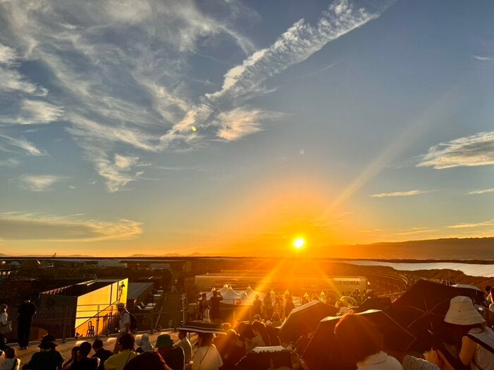 今にも沈もうとする夕日が大屋根リングと会場を照らす、幻想的な1枚です。