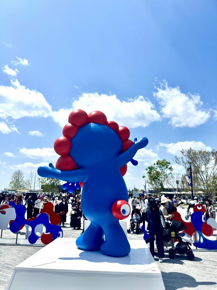 青い空と白い雲に映える、ミャクミャクの後ろ姿「ミャクけつ」。