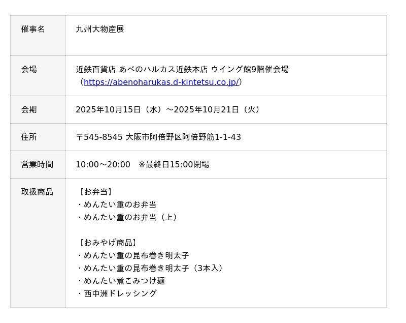 元祖博多めんたい重株式会社は、2025年10月15日(水)~10月21日(火)までの7日間、近鉄百貨店 あべのハルカス近鉄本店にて開催される『九州大物産展』に出店いたします。お店の定番メニューがそのままお弁当になった「めんたい重のお弁当」の他、「めんたい重の昆布巻き明太子」や「めんたい煮こみつけ麺」「西中洲ドレッシング」などのおみやげ商品もその場で販売いたします。