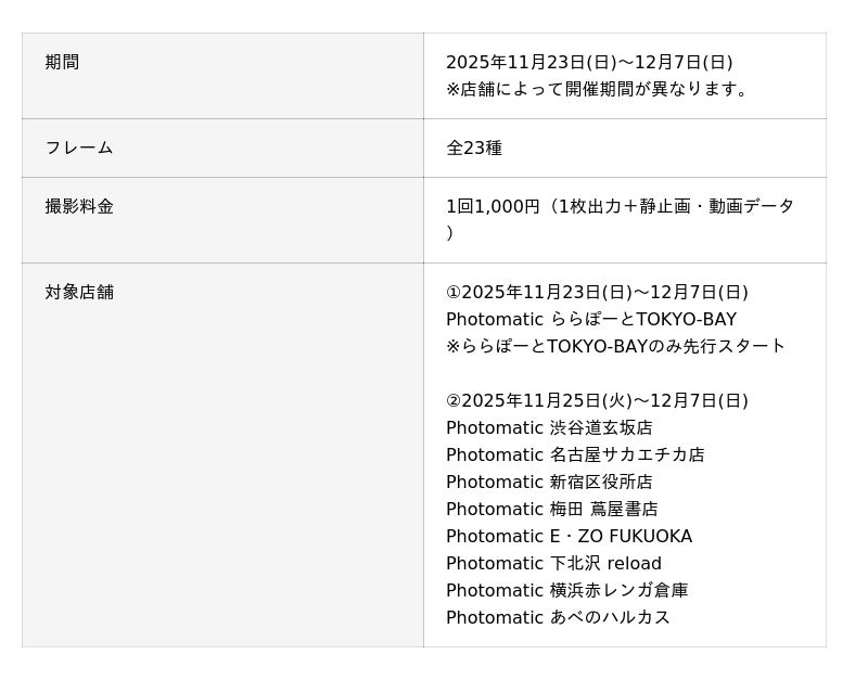 キタムラ・ホールディングス グループのピックハイブ株式会社(本社:東京都新宿区、代表取締役社長 兼 COO:大迫 由典)が運営するセルフフォトブランド「Photomatic(フォトマティック)」は、11月23日(日)から人気VTuberグループ「ぶいすぽっ!」と初のコラボレーションを実施いたします。このコラボレーションは、LaLa arena TOKYO-BAYで実施される「ぶいすぽっ!フェス 2025」の開催に合わせ、イベント会場近隣のPhotomatic ららぽーとTOKYO-BAYでの11月23日(日)からの先行展開を皮切りに、全国の9カ所のPhotomaticで期間限定で展開。ぜひお近くのフォトブースで、ぶいすぽっ!メンバー23名との記念の1枚の撮影をお楽しみください。