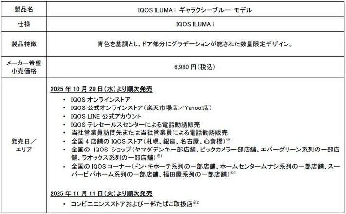 フィリップ モリス ジャパン合同会社(本社:東京都千代田区、社長:シェリー・ゴー、以下「PMJ」)は、加熱式たばこ「IQOS ILUMA i シリーズ」より、青色を基調とし、ドア部分に施されたグラデーションが特徴の数量限定「IQOS ILUMA i ギャラクシーブルー モデル」を、2025年10月29日(水)よりIQOSオンラインストア、IQOS公式オンラインストア、IQOS LINE公式アカウント、IQOSテレセールスセンターによる電話勧誘、全国4店舗のIQOSストア※1、IQOSショップ、IQOSコーナーで順次発売いたします。また、11月11日(火)から、コンビニエンスストアおよび一部たばこ取扱店※2でも順次発売を開始いたします。