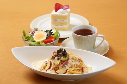 <カフェ メノレ> サツマイモを使ったほっこりクリーミーなパスタ、食後のデザートとドリンクをセットにしたランチセット。 サツマイモとベーコンのパスタランチセット(1人前) 2,200円 ※ジェイアール名古屋タカシマヤ限定 ※各日10食限り ※ランチタイム(午前11時30分~午後2時)のご提供 ※デザートとドリンクの内容により、料金が変わります■5階 カフェ メノレ