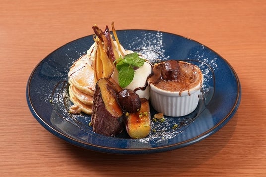 <ハンバーガー&カフェ ルイス> ほっくり甘いサツマイモと、香ばしい栗をふんだんに使いました。秋のやさしい風味が口の中にふわっと広がります。秋の贅沢パンケーキ(1人前)1,650円 ※ジェイアール名古屋タカシマヤ限定 ※各日午後2時からの販売 ■8階 ハンバーガー&カフェ ルイス