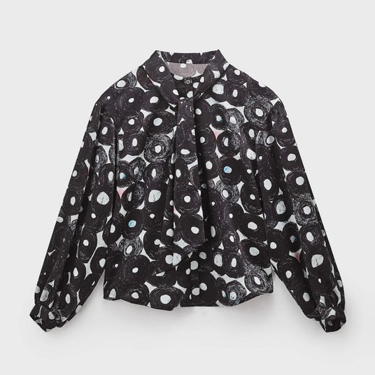 「障害のある作家から生まれたアート」に光を当て、その強烈なアイデンティティから生まれるプロダクトを社会に届ける<ヘラルボニー>。ブランドを代表するアート「(無題)(丸)」のブラウスは、太幅のボウタイとボリュームスリーブが華やかな存在感を演出します。