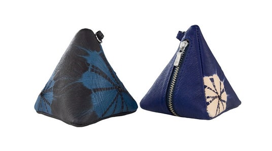 テトラポーチ(外側:鹿革、内側:馬革/約一辺10×高さ9cm/絞りブルー・絞りネイビー)各22,000円(10点限り)※ジェイアール名古屋タカシマヤ限定