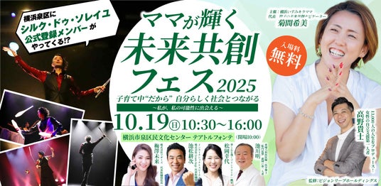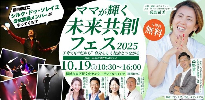 子育て支援団体「横浜いずみキラママ」は、子育て中の女性が自分らしい生き方のヒントを見つけるための祭典「ママが輝く 未来共創フェス 2025」を、2025年10月19日(日)に横浜市泉区文化センター テアトルフォンテにて開催します。本イベントには、世界的なエンターテインメント集団「シルク・ドゥ・ソレイユ公式登録メンバー」の世界No1ジャグラーの来訪が決定しているほか、「胎内記憶」研究の第一人者である池川明氏、3億円の負債から復活したインターナショナルスピーカーの池松耕次氏など、多彩な専門家が登壇します。本イベントは株式会社ビジョンリープホールディングスの協力のもと実施されます。