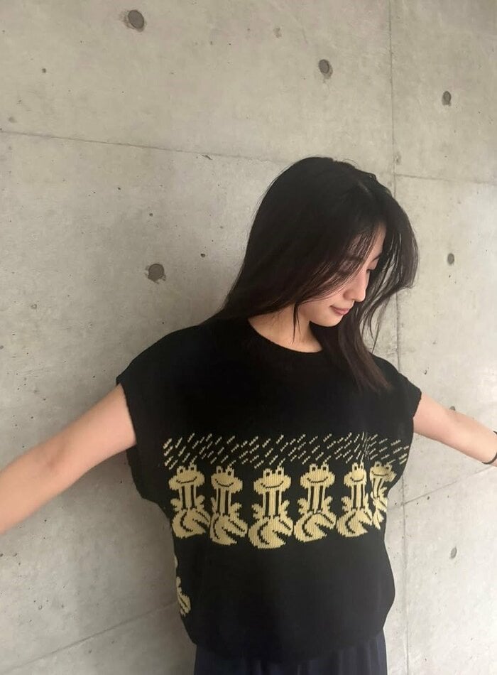 ニットのデザインに注目してみると、お腹の部分にはハスの上に雨を浴びながらちょこんと座ったカエルが一列に並んでいて、首元は広く開いた形に。そして後ろには…