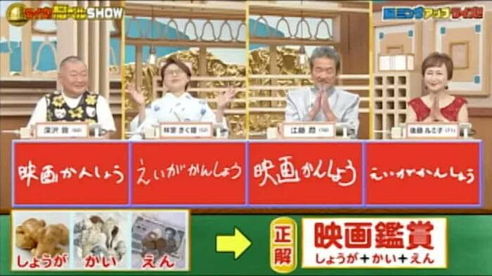 正解は「えいがかんしょう(しょうが+かい+えん)」。全員正解!