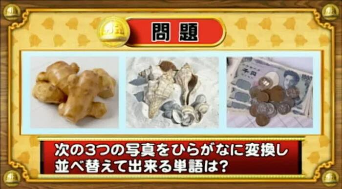 最後は、シャッフル写真の問題。次の3つの写真をひらがなに変換し、並べ替えて出来る単語は何でしょうか?