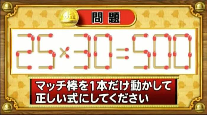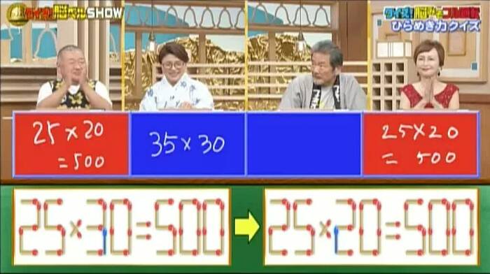正解は、左の式の「3」から1本動かして「2」にします。そうすれば「25×20=500」となります。深沢さんと後藤さんの2人が見事正解!
