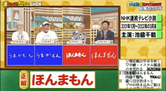 正解は「ほんまもん」。花井さんと田尾さんが正解!ちなみに田尾さんは、ヒロインの母親の同級生役で出演していました。