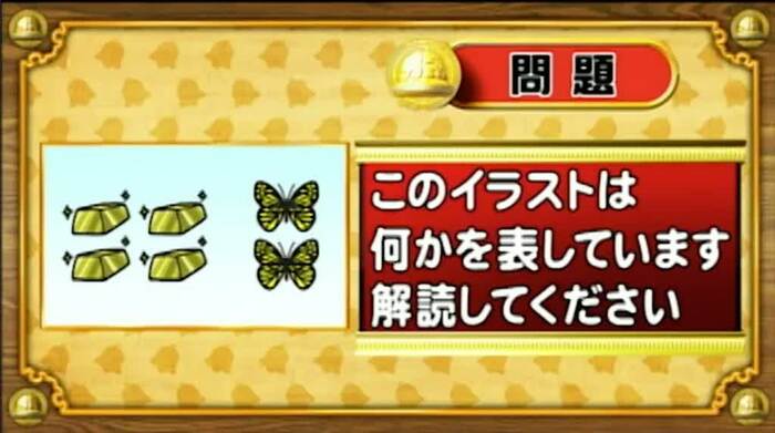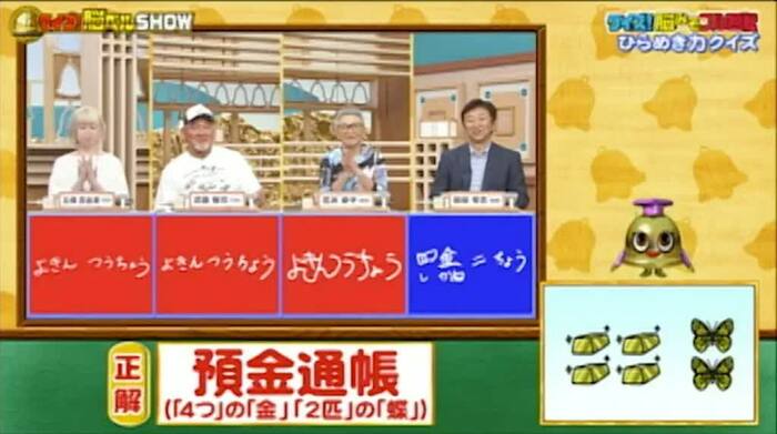 正解は「預金通帳(『4つ』の『金』『2匹』の『蝶』)」。五條さん、武藤さん、花井さんが正解。