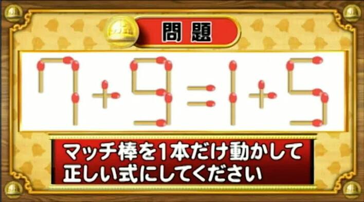 最初は、マッチ棒問題。次の式のマッチ棒を1本だけ動かして正しい式にしてください。