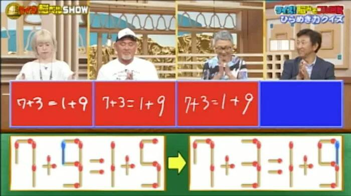 正解はまず、左の式の「9」から1本動かし「3」にします。その1本を右の式の「5」に足して「9」にします。そうすれば「7+3=1+9」となります。五條さん、武藤さん、花井さんの3人が正解。