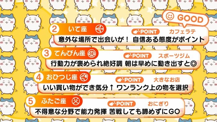 『めざましテレビ』で放送中の「ちいかわ占い」 テレビ放送がない日はお休みで、月~土:朝7時以降に更新予定です。