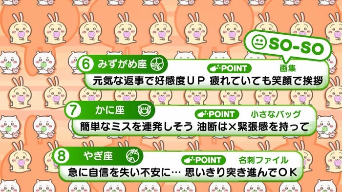 『めざましテレビ』で放送中の「ちいかわ占い」 テレビ放送がない日はお休みで、月~土:朝7時以降に更新予定です。