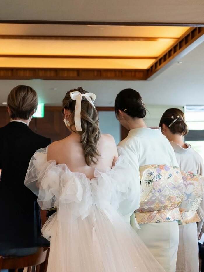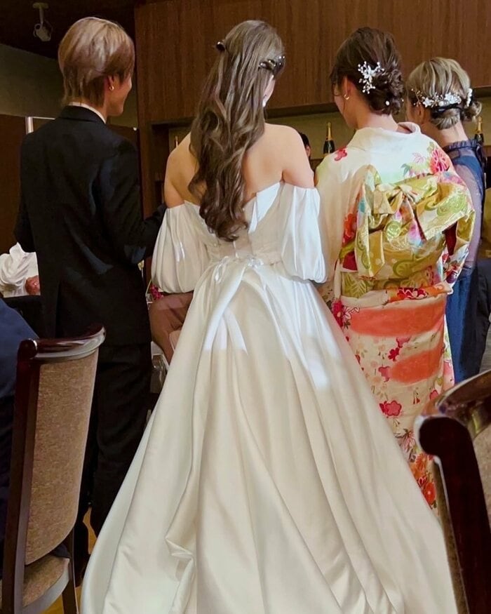 真っ白なドレスに身を包んだ妹を囲むように、向かって左隣に黒いスーツ姿の藤原さん。そして右隣には、色留袖を着た姉や妹の後ろ姿を捉えた きょうだい4ショット。