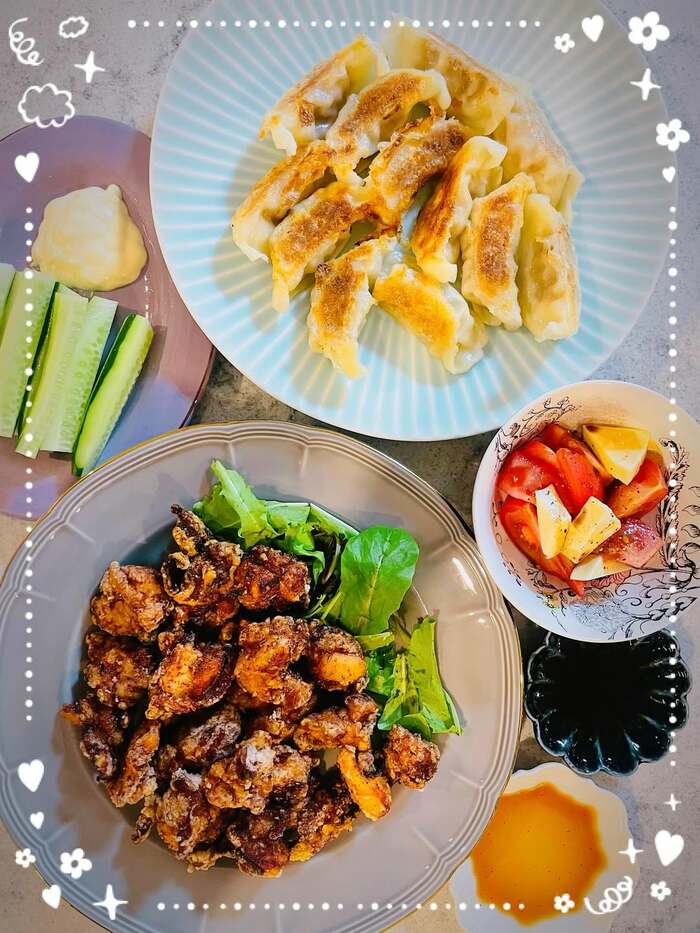 さらに、水色のお皿には焼き目がおいしそうな餃子や・・・
