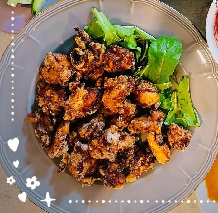 丸い平皿には、カリッと揚げられた たくさんの唐揚げと、ボリューム満点な4品を26分で作り上げる平さん。さすがの腕前です!写真を見ているだけでお腹が空いてきてしまいますね。
