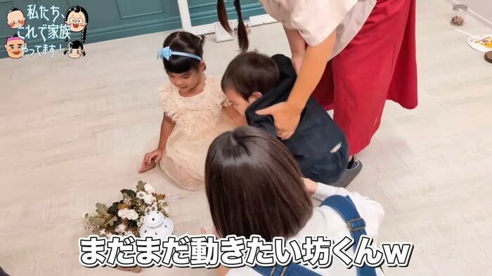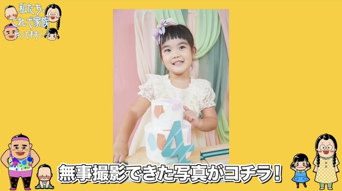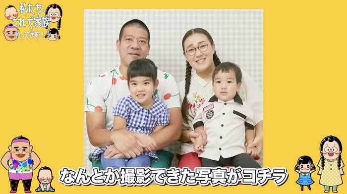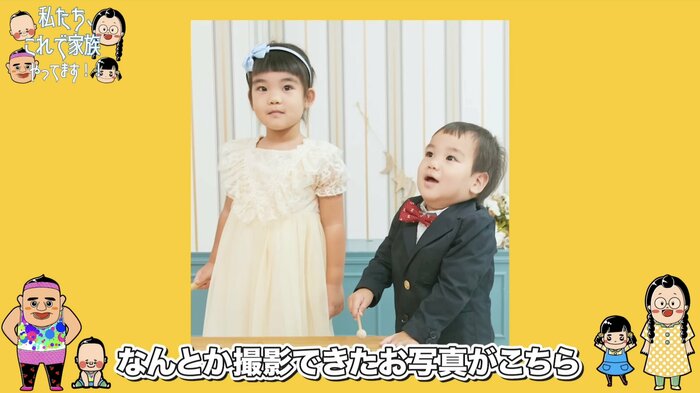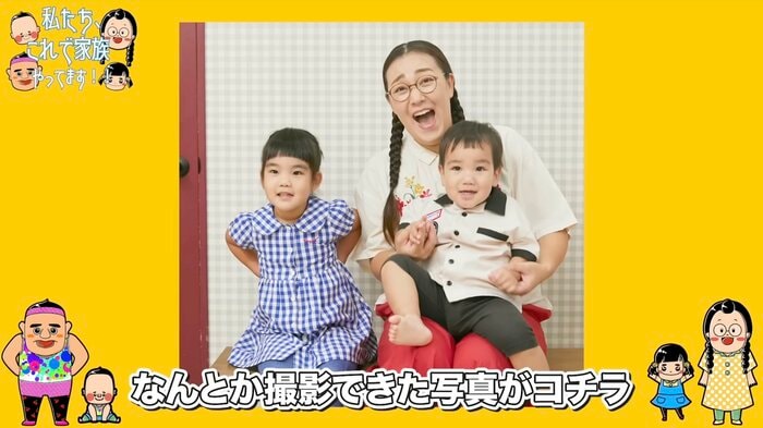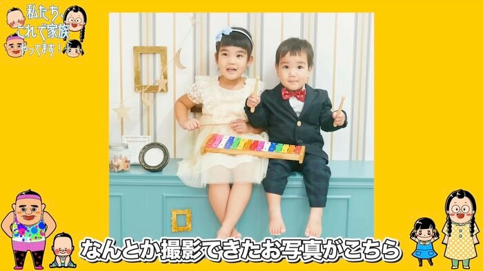 そして、なんとかスタッフがあやして撮影した3人の写真を見てみると、顔を上げて何かを見つけたような表情をしている子供2人と、口を開けて笑顔を浮かべるチェリー吉武さんの姿がおさめられています。