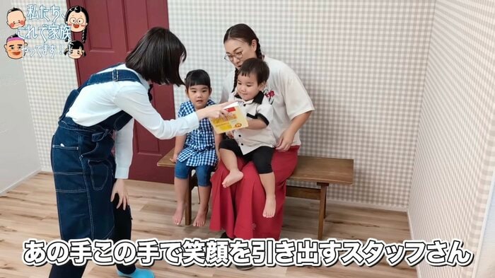 子供2人での笑顔を引き出すべく、白鳥さんが声をかけたり、スタッフがおもちゃであやすと…