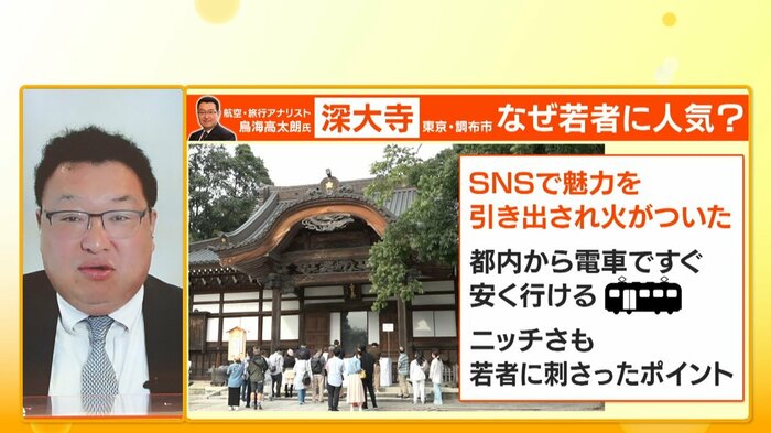 航空・旅行アナリストの鳥海高太朗氏によると、東京・調布市の「深大寺」や静岡・熱海市が人気の理由として、“都心から気軽に行くことができる”という点もあるといいます。