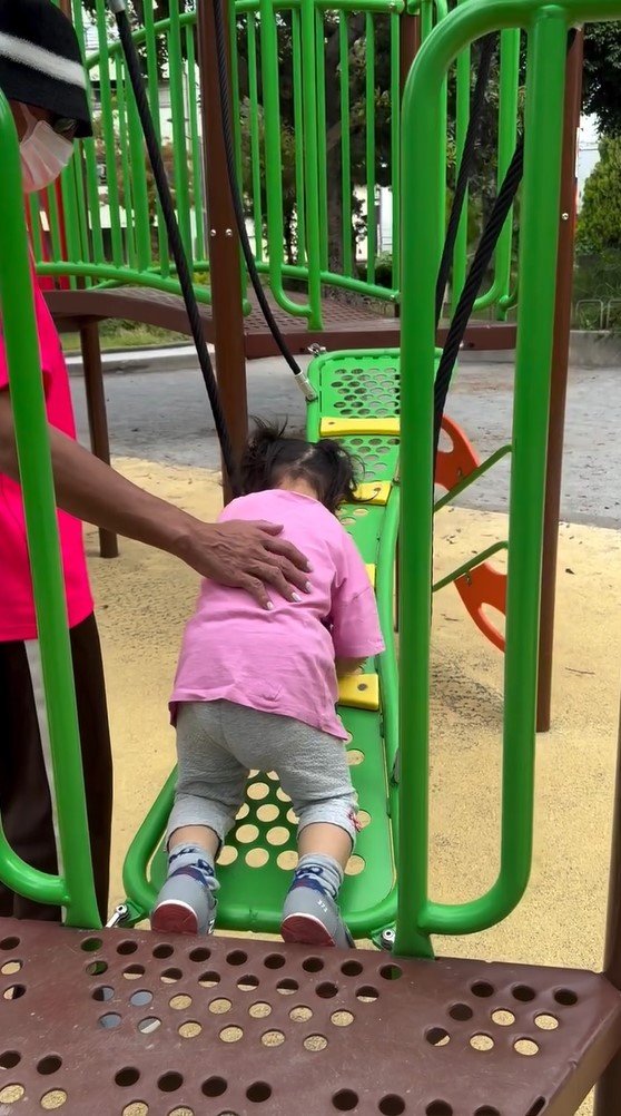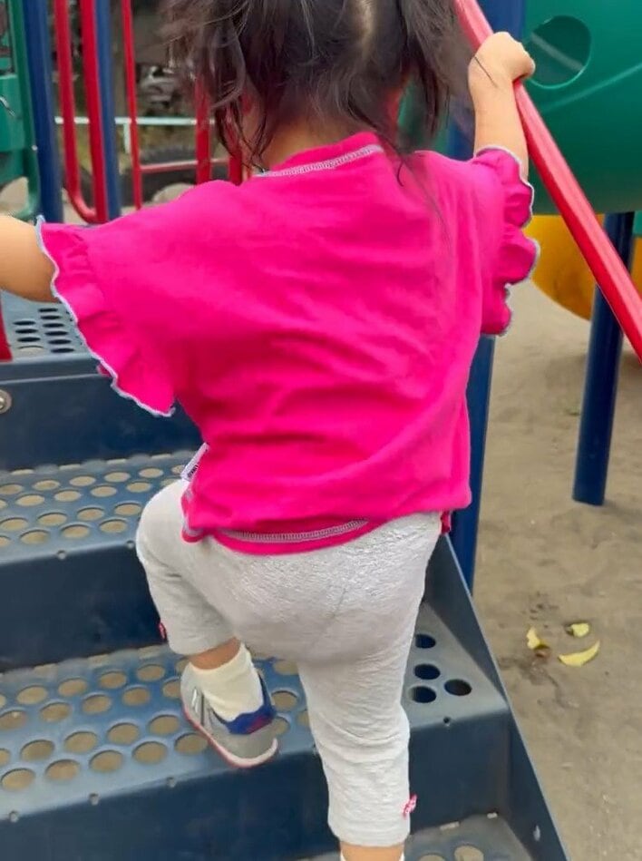 投稿では、ビビットなピンクのTシャツにズボンをはいた、動きやすそうな服装で滑り台の階段を軽快に登っていく“ぷくぷくちゃん”の後ろ姿が。