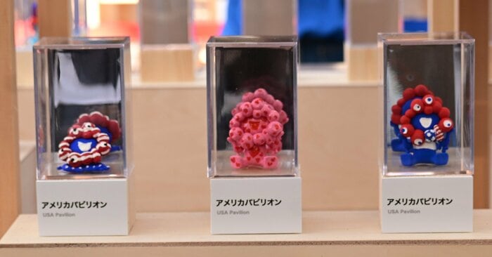 続いて、アメリカパビリオンからは、赤×白ボーダーのアメリカ国旗をイメージしたミャクミャクや、全身ピンクに、ハート模様が描かれたラブリーなミャクミャクも。