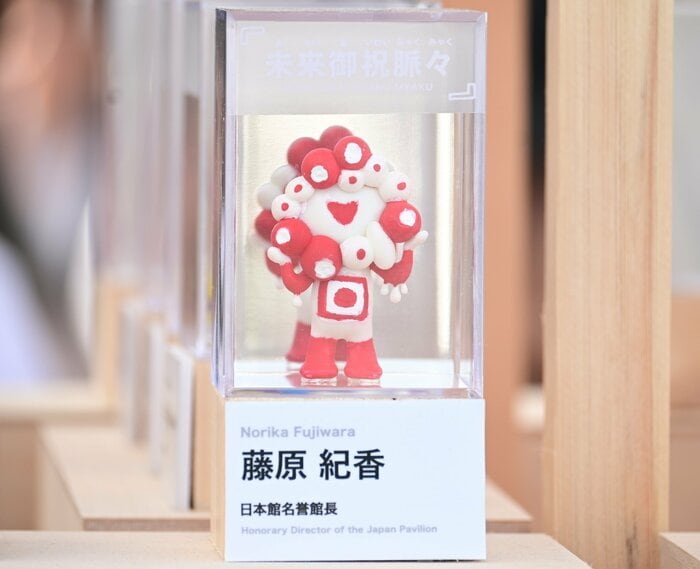 その隣には、日本館の名誉館長を務めていた藤原紀香さん制作の“紅白ミャクミャク”も展示。