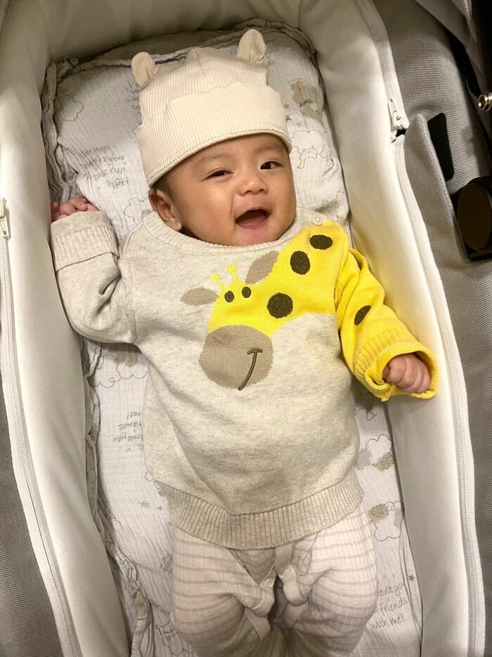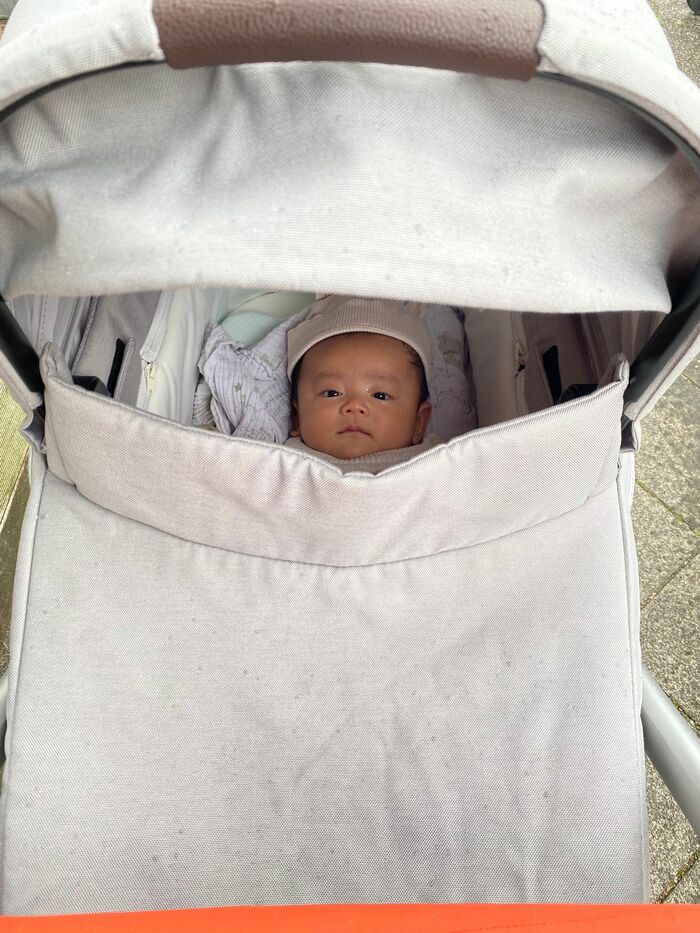 そして、病院からの帰り道、ふとベビーカーをのぞいてみると、不機嫌そうな顔をしていたので写真を撮ったとのこと。ちなみに、ちょっぴり不機嫌な顔は普段あまり見せないということです。