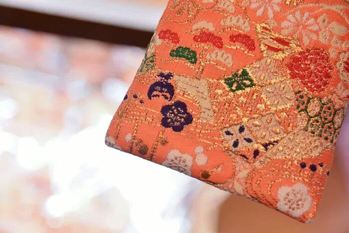 人気商品の「御朱印帳」と同じ生地を使用した「ばね口ポーチ」は、眼鏡などの身の回りの小物を入れるのにぴったり。この生地、よーく見てみると…
