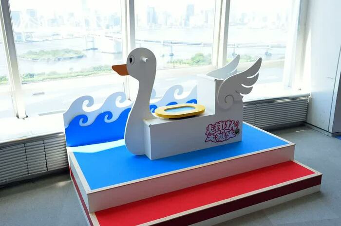 座ると何かが起こる?「アヒルのおまる」は台場で初登場のフォトスポット!しかもここは25階の展望室なので、アヒルの背景にはお台場の海が広がり、レインボーブリッジが見下ろせる絶好の“映えスポット”になっています。