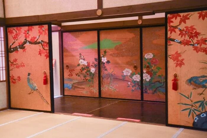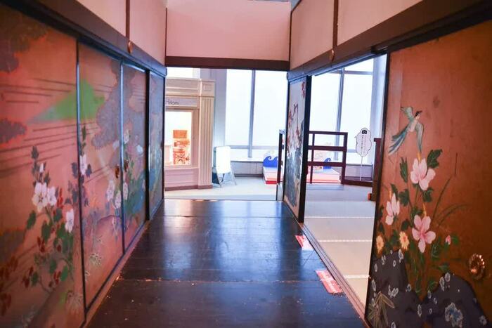 殿の部屋をぐるっと囲うように作られたセットに足を踏み入れると、豪華な装飾や見事な襖絵、足元には年季の入った板張りの廊下が。もちろんすべて実際に収録で使用されていたセットです。