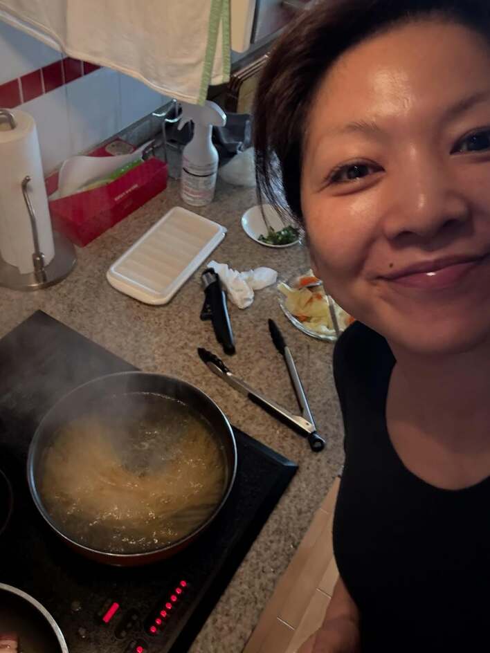 キッチンでパスタをゆでているショットでは、カメラに向かってニッコリほほ笑む飯島さんの姿が収められています。カウンターにはカットされた野菜がチラ見えしています。