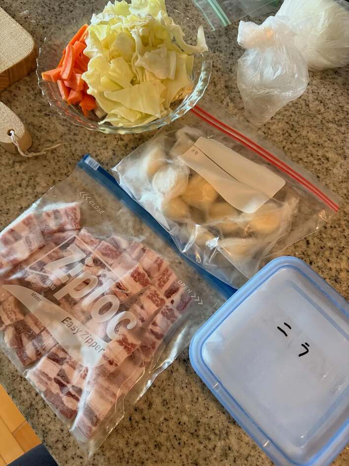 飯島さんによると「切れはしの野菜(キャベツ、ニンジン、冷凍ニンニク、冷凍ニラ、冷凍ベーコン、とんがらし、ガラスープ素入れときゃなんとかなる)」と、残っていた食材を有効活用した様子!キッチンの台には、たっぷりの野菜やジッパー付き保存袋に入ったベーコン、ニラと書かれた保存容器が置かれています。