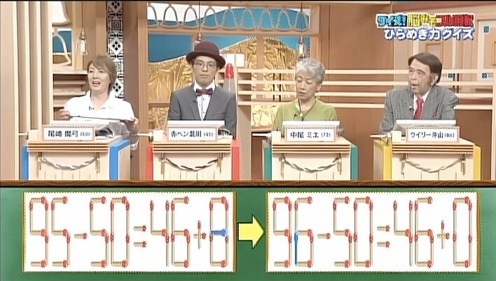 「95-50=46+8」。この式のマッチ棒を1本だけ動かして正しい式にしてください。