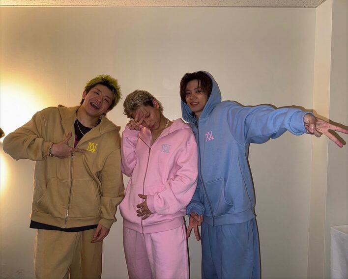 岸さんは、「北海道サイコーーっす!!!!またいきます!!!!!!」と、現在実施中のツアーのオフショットを公開。岸優太さんが黄土色、平野紫耀さんがピンク、神宮寺勇太さんがブルーと、色違いのジャージを着た3ショットを披露しました。
