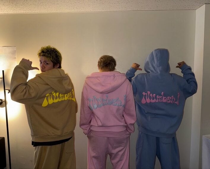 背面に書かれた「Number_i」の文字を見せるようにバックショットの3人。岸さんだけコチラに顔を向け、背中の文字を指差す仕草をしています。