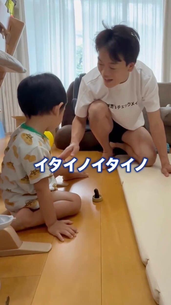 動画では、ラフなスタイルのおばたのお兄さんから心配そうに「痛かった?」と聞かれる長男の姿が。リビングの床にちょこんと座っていて「痛かった」と足元を気にしているようです。